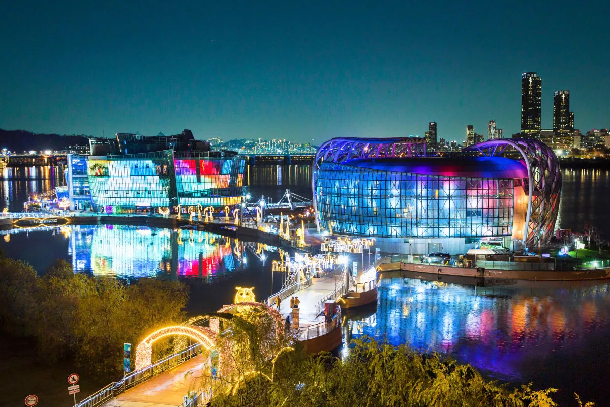Experience the beauty of Sevit Island, a group of stunning artificial floating islands on the Han River, glowing beautifully against the city skyline. This landmark blends nature, architecture, and light, offering breathtaking views both day and night. Enjoy romantic riverside walks, dining with a view, or scenic photo spots — making it a perfect destination for couples, friends, and travelers alike.